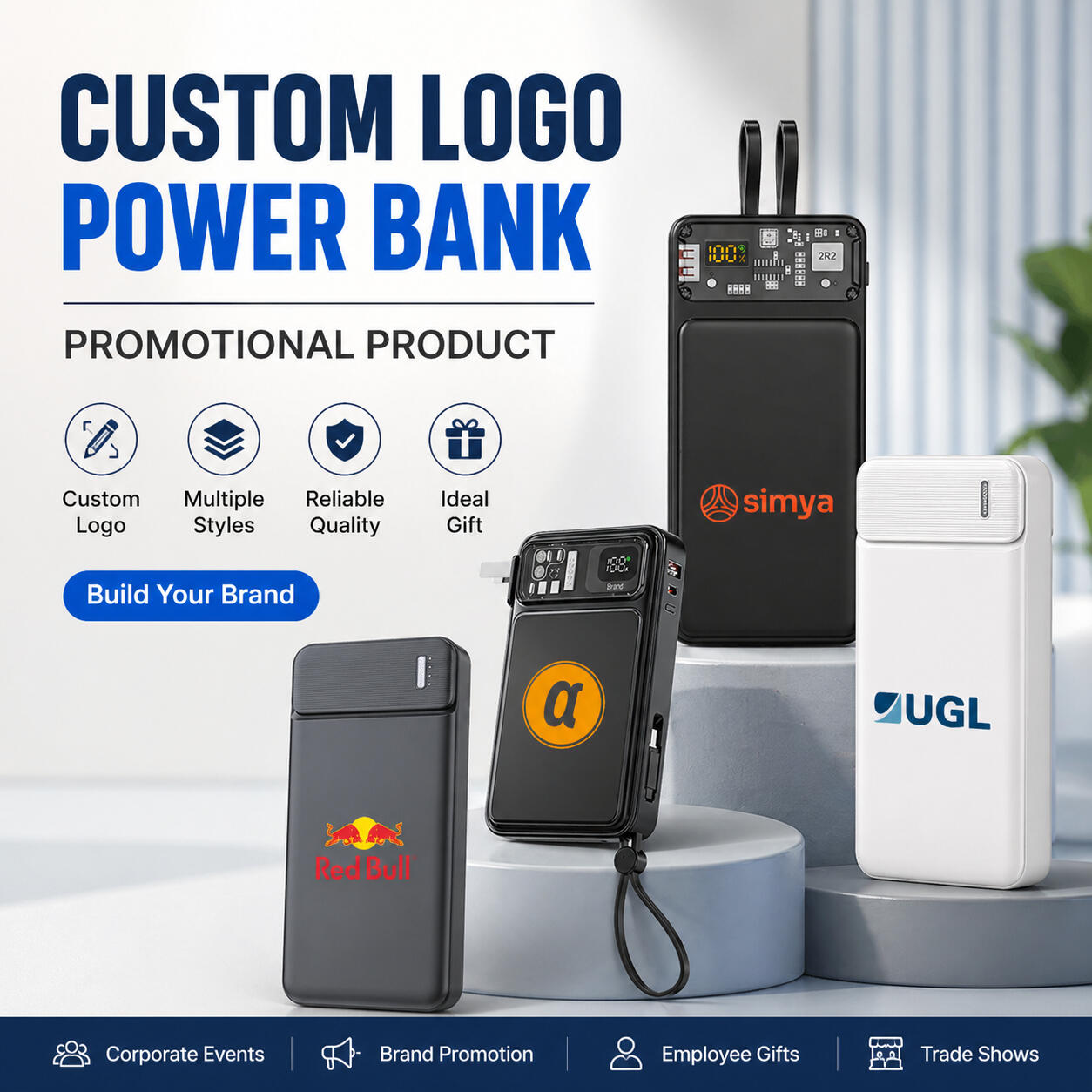 High-capacity portable power banks with custom branding.